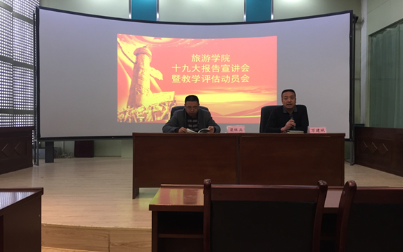 20171026日,学院书记李发舜、院长把多勋在全院大会上分别宣讲十九大精神,深入阐释了十九大的新精神、新思想、新判断,要求全院教师率先学习十九大精神,将十九大精神融入日常教学当中。