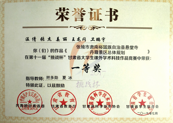 由把多勋教授和夏冰老师指导、旅游管理专业研究生姜丽负责的《张掖市肃南裕固族自治县马蹄寺景区运营与发展策划方案》在第十一届“挑战杯”甘肃省大学生课外学术科技作品竞赛中荣获“二等奖”。