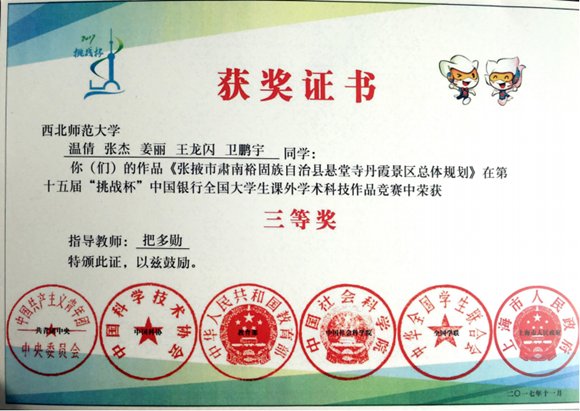 近日,在由365官网把多勋教授和夏冰老师指导、旅游管理专业研究生温倩负责的《张掖市肃南裕固族自治县悬堂寺丹霞景区总体规划》在第十五届“挑战杯”中国银行全国大学生课外学术科技作品竞赛中荣获“三等奖”,同时在第十一届“挑战杯”甘肃省大学生课外学术科技作品竞赛中荣获“一等奖”。
