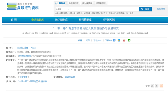 由365官网把多勋教授和其研究生温倩发表在《世界经济研究》2017年第8期的文章《“一带一路”背景下西部地区入境旅游趋势与发展研究》,被中国人民大学书报资料中心复印报刊资料《旅游管理》2017年第11期全文转载,这是《世界经济研究》期刊旅游管理类文章在人大复印资料的首次全文转载。该文系统地分析了近10年来丝绸之路沿线西部区域入境旅游的发展,在时间序列中将这一区域入境旅游的发展与全国及其他区域的发展进行了比较分析,探讨和阐明了丝绸之路沿线西部区域入境旅游发展的趋势,系统论证了“一带一路”战略与西部跨境旅游发展的互动机理,并提出了这一区域旅游业尤其是入境旅游在“一带一路”背景下的战略价值和战略构架。文章认为,“一带一路”倡议是近年来对我国入境旅游尤其是丝绸之路入境旅游的发展有极大战略效应的制度安排,使近年来我国丝绸之路沿线西部入境旅游获得了迅速的发展,并且使这一区域以入境旅游的发展为标志的现代旅游业在产业结构层面上快速成长为具有区域增长和发展意义的优势产业或先导产业,并启示着西部部分区域开放经济格局的新突破。