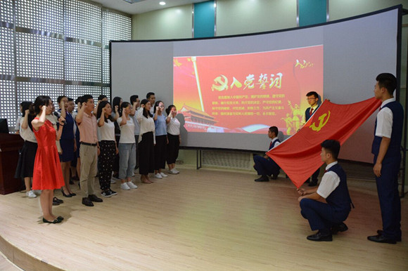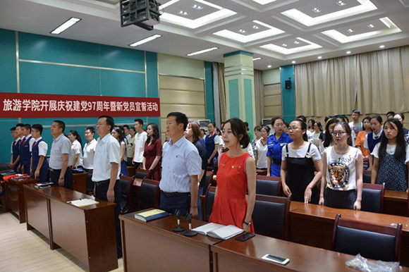 活动在雄壮的国歌声中开始。万建斌副院长宣读了新发展的23名预备党员名单。在旅游管理专业学生第一党支部书记王瑞老师的带领下,新发展党员、在场的老师、学生党员一同宣读入党誓词,全场气氛庄严肃穆。随后,各党支部书记、党员代表为新党员佩戴了党徽。李发舜书记对本次新发展的党员表示祝贺,要求学生党员要以党员的标准严格要求自己,树立良好学风,争做新时代优秀大学生。