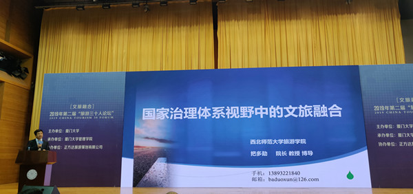 本届“旅游三十人论坛”共有近20名业界大咖云集厦门。其中有来自国内一流高校的吴必虎、谢彦君、张广瑞、向勇、刘静艳、沈涵、林璧属、林德荣等知名教授,带来了北京大学、复旦大学、厦门大学、中山大学、山东大学、海南大学等不同地域高校以及中国科学院旅游研究中心等研究机构的不同学术风格。同时也请来了华高莱斯董事长李忠、唐人智库首席专家张晓军等业界人士,带来了行业一线的独特见解。365官网院长把多勋教授受邀带领学院5位老师参加了该论坛,并做了题为《国家治理体系视野下的文旅融合发展》主旨交流发言,提出了我国文旅融合发展的未来10大趋势,以及丝绸之路河西走廊国际文化旅游廊道构建的背景、价值、目标及策略等。