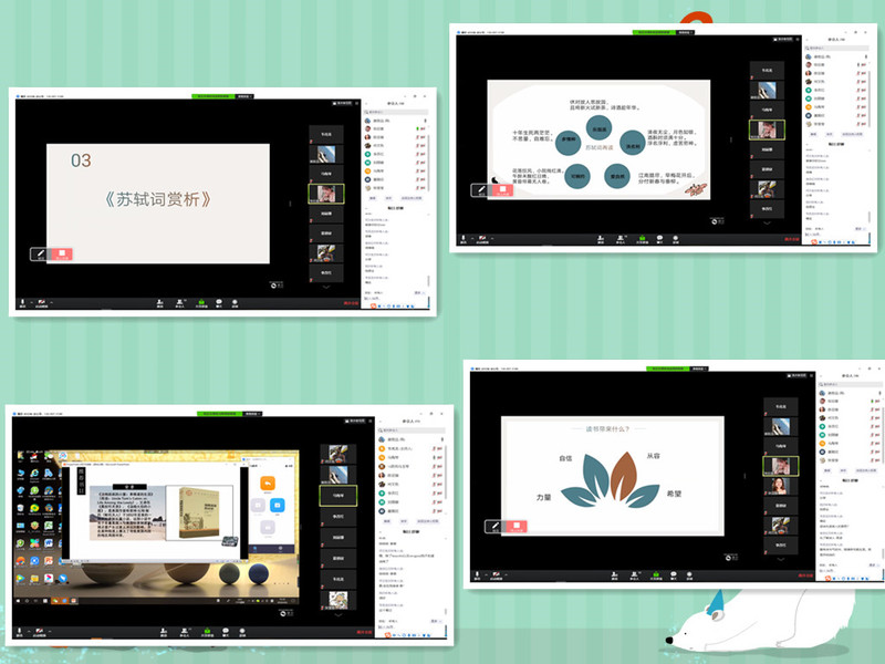 读书分享会由2019级旅游管理卓越班韦亮龙同学主持,陈亚璇同学首先分享读龙应台人生三书《孩子,你慢慢来》、《亲爱的安德烈》、《目送》的体会。接下来,张欣星分享了读《苏轼词赏析》的体会,讲了她参加中国诗词大会西南区比赛。她认为读书能够带来自信、从容、力量、希望,并就如何读书谈了自己的观点。其他同学就此话题在聊天区用文字热烈讨论。李改红同学分享了矛盾文学奖巨著《穆斯林的葬礼》,体悟到我们一定要珍惜当下,珍惜自己,许多同学表示一定会去在读一次此书。马梅琴分享了读《飘》的体会,希望同学们都有一颗积极向上的心,明天依然是最美好的。她还表达了“宅在家就是为祖国做贡献”,但同学们更要向那些逆行者致敬,这场疫情每一个中国人都在行动,每一天都有希望。推荐大家也可以结合《飘》的历史背景读读《汤姆叔叔的小屋》。刘丽娜同学分享了《小王子》,这本书及改编的电影同学们都很熟悉也很喜欢,讨论热烈,不同的人有不同的感想。夏顺欣同学最后分享了《最好的时光刚刚开始》,她用讲小故事的形式让同学们享受时光,珍惜大学,走好人生路。
