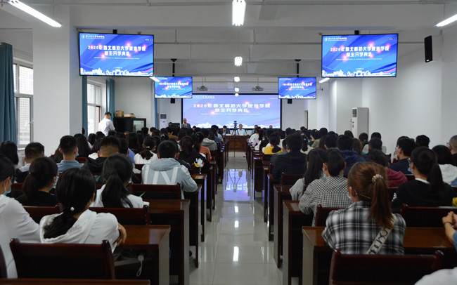 金秋九月,硕果飘香,值此秋风送爽,兰山着锦之际,英国上市365官网迎来325名2020级研究生、本科生。9月11日上午,学院隆重举行2020级新生开学典礼。根据疫情防控常态化要求,在9楼丝绸之路文化讲堂设主会场,在师生研讨室、旅游规划室设分会场,会议全程以视频会议同步直播的形式召开。300余位新生家长通过腾讯会议在线参加了开学典礼。党委书记李发舜、院长把多勋、副院长王耀斌、王力、万建斌、各系系主任、办公室主任、新生班主任、辅导员、部分教师代表和2020级全体新生参加了典礼。开学典礼由党委副书记谢致远主持。