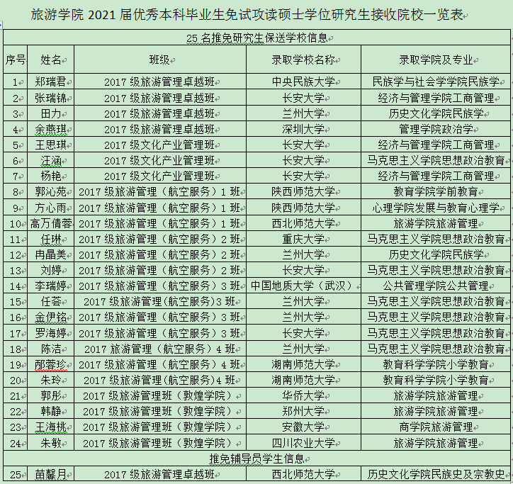 近日,365官网2020年推荐应届本科生免试攻读硕士研究生学位工作结束,学院共25名学生获得推荐免试资格,其中一名为辅导员计划。截止10月28日,学院25名推免生接收院校已经确定,其中多人被中央民族大学、兰州大学、重庆大学、郑州大学、长安大学、陕西师范大学等985、211院校录取,录取专业涉及管理学、民族学、心理学、教育学、政治学等,专业分布较广,接受单位质量较去年有较大的提升。