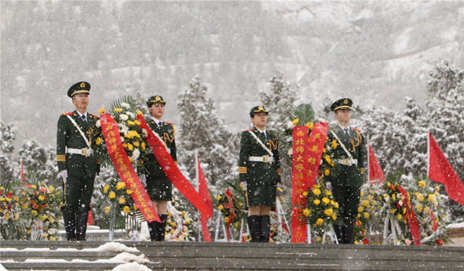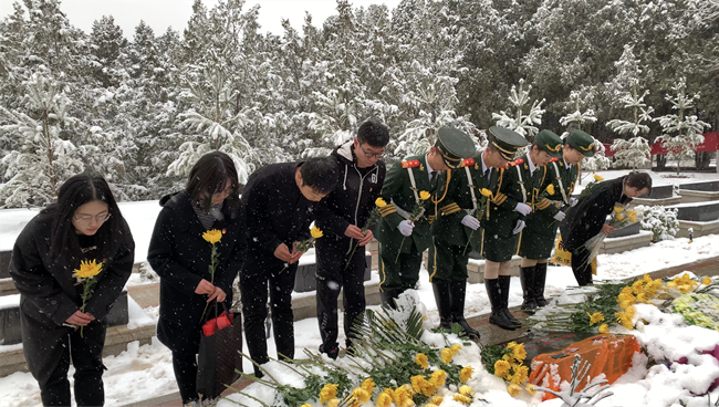 迎着凛冽的风雪,浸湿了鞋袜、模糊了视线、冰寒了双手,但不会阻挡住师生们对革命烈士的无限哀思和深情缅怀!天幕低垂,松柏苍苍。纪念广场上,巍峨的人民英雄纪念碑庄严矗立,“人民英雄永垂不朽”几个镏金大字刚劲有力、熠熠生辉。师生代表整齐列队,脱帽肃立。上午9时30分,向人民英雄纪念碑敬献花篮仪式正式开始,伴随着《义勇军进行曲》,全场高唱中华人民共和国国歌。激昂的旋律,响彻烈士陵园,深深感染着在场每一个人。