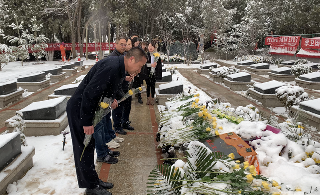 青山有幸埋忠骨,黄河激荡慰英灵。雪映松柏愈青青,红军精神伴吾行。清晨的烈士陵园英魂苑内哀乐低回,庄严肃穆,刻有“陈红军烈士(1987年3月—2020年6月)”大字的方形墓碑巍然矗立。墓前鲜花簇拥,一张张祭奠卡片让人泪目。全体师生肃立默哀、鞠躬致敬,依次向陈红军烈士献上鲜花致以崇高敬意和深切缅怀。
