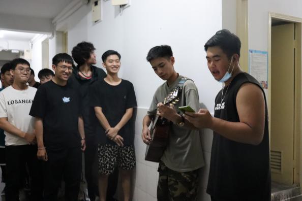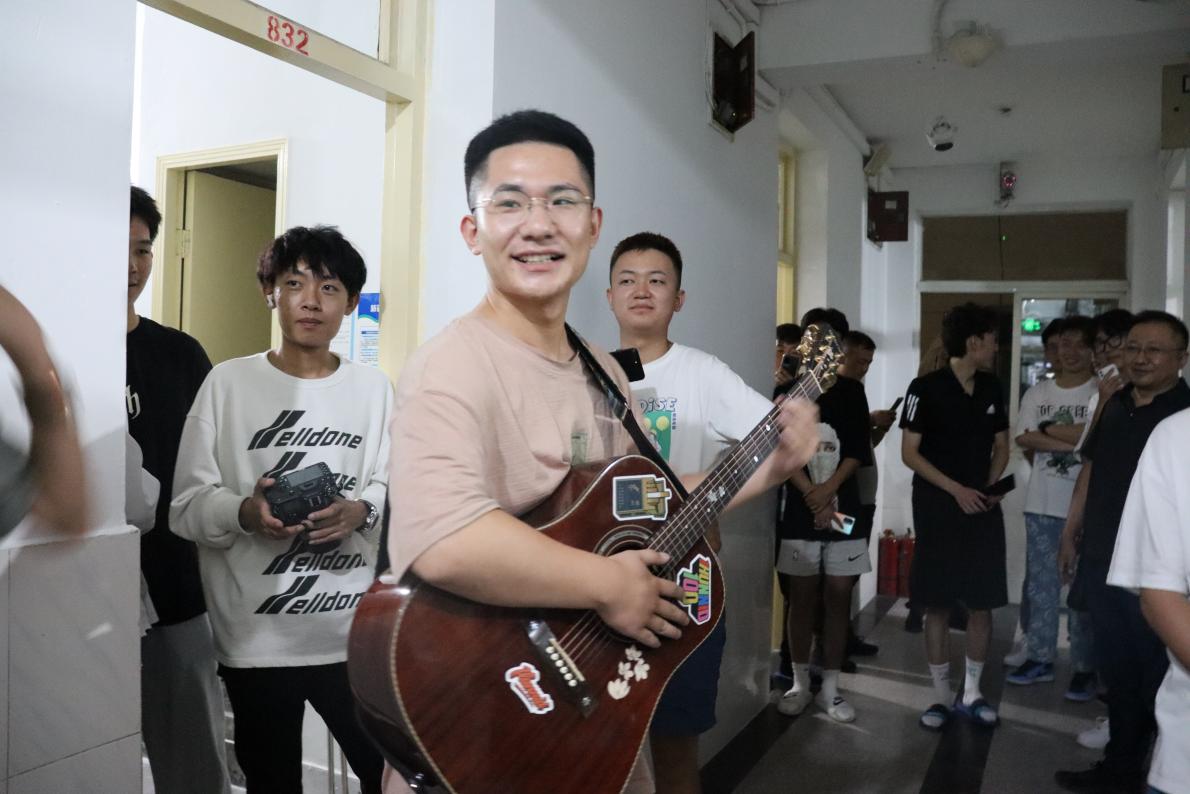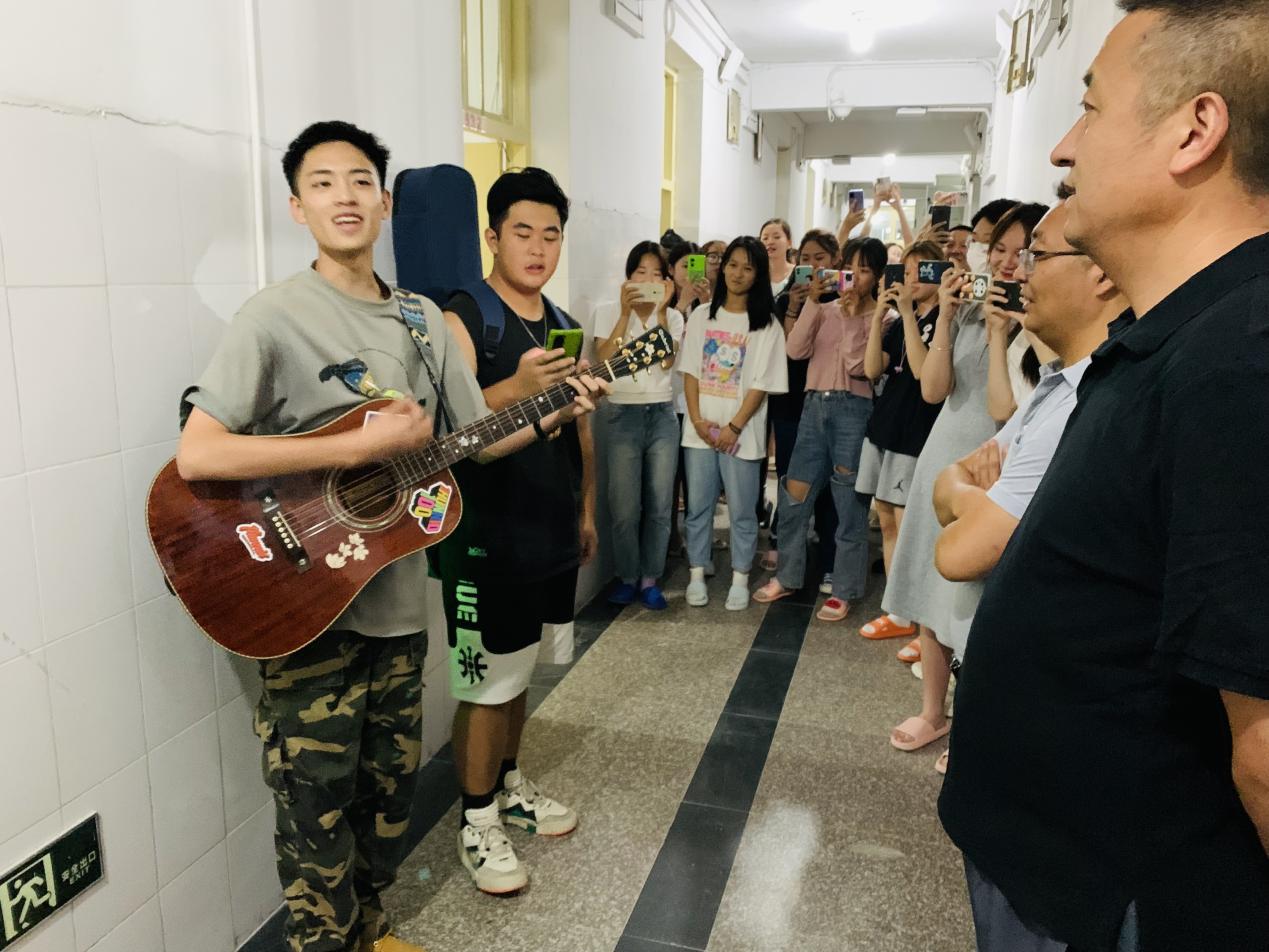 结束慰问后,新生们纷纷热情地与领导们挥别,2021级航空服务艺术与管理4班新生赵凡同学为学院老师与同学们弹唱了一首《春风十里不如你》表示感谢,一声声祝福的歌声,承载着新生们对院领导和老师们的尊敬与感谢,联结起了师生之间情谊的桥梁。