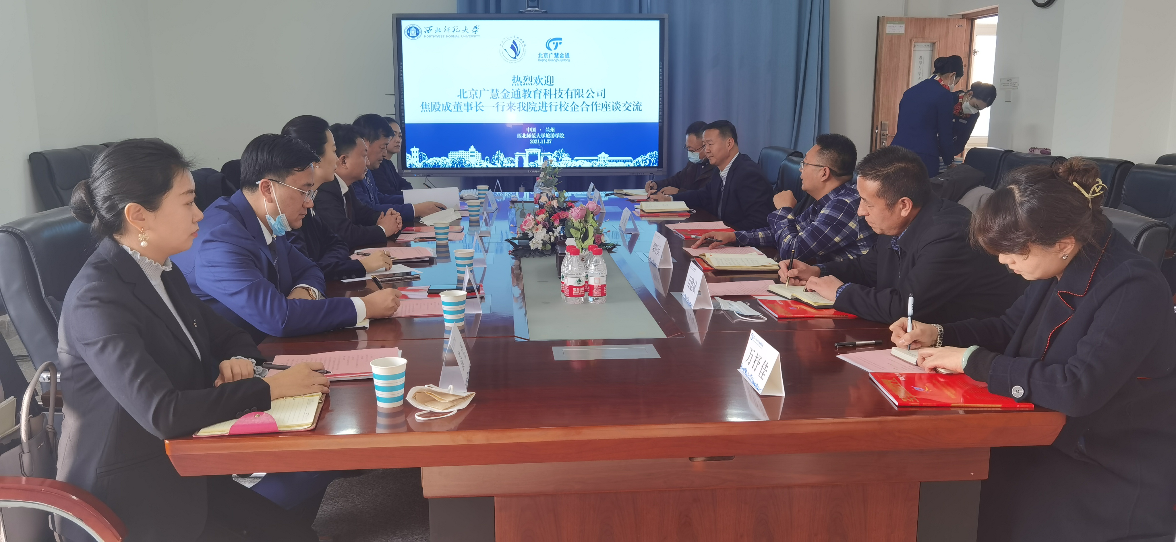 11月27日,北京广慧金通教育科技有限公司董事长焦殿成、副总经理付晓军、李青谦一行来365官网进行考察交流,校纪委书记马庆、学院党委书记谢致远、院长梁旺兵、副院长万建斌、柴亚林,学院党委副书记戴小武,航空服务与管理系副主任万抒佳,北京广慧金通教育科技有限公司驻西北师范大学工作处主任席聪等人参加了座谈会。