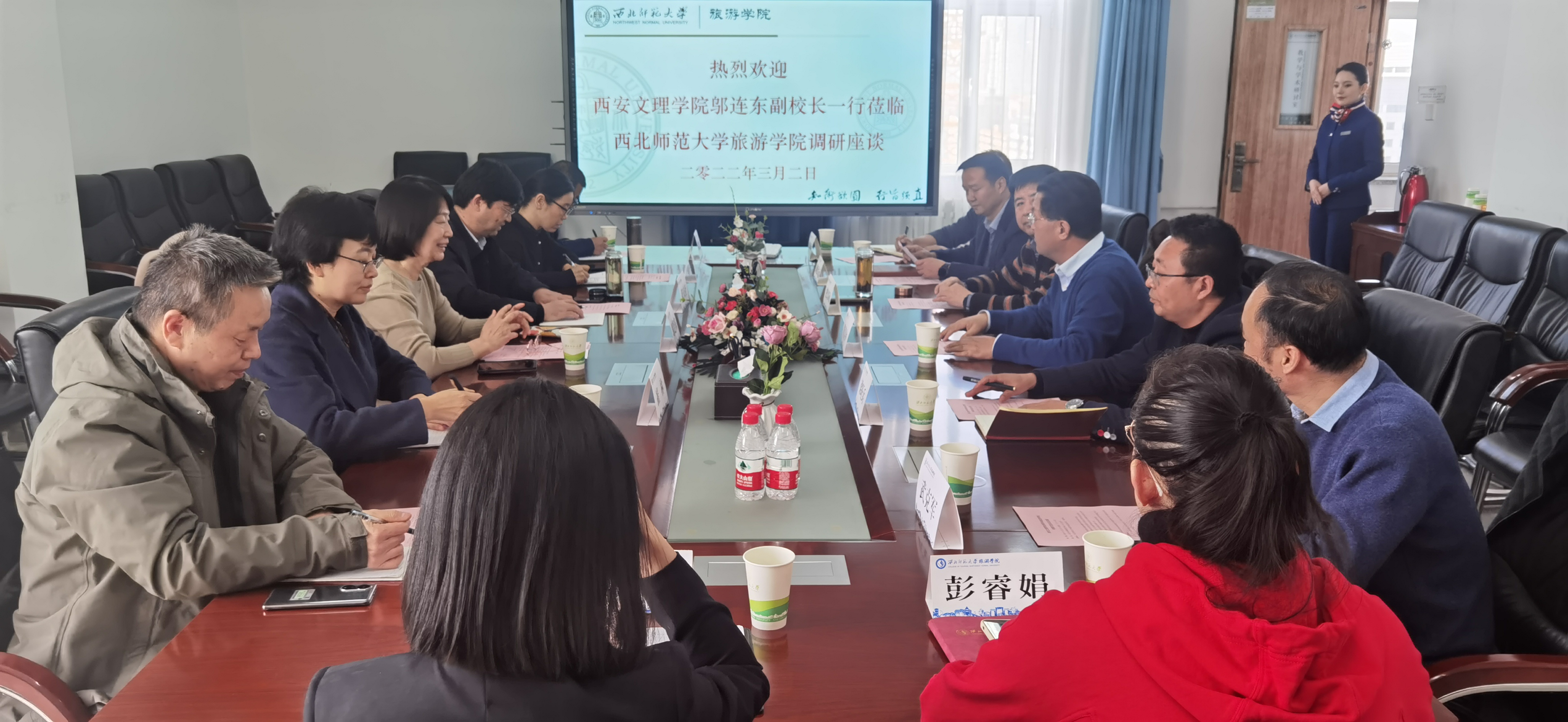 座谈会上,董晨钟副校长代表学校对邬连东副校长一行的到来表示欢迎,并简要介绍了学校办学特色、优势学科、特色专业等情况,希望双方在人才培养、专业建设、学科发展等领域加深交流合作。甘肃省旅游发展研究院执行院长把多勋教授介绍了学院基地平台建设及社会服务情况,阐释并分享了旅游学科高质量发展的新理念、新思路与新经验。院长梁旺兵教授介绍了学院基本情况,表示希望与西安文理学院历史文化英国上市365官网在本科教学、科学研究等方面进一步展开合作。副院长柴亚林副教授介绍了学院旅游管理专业国家级一流本科专业建设及实验室建设情况。北京广慧金通教育科技有限公司驻西北师范大学工作处主任席聪就学院航空服务艺术与管理专业历年招生就业、学生职业发展等情况进行了说明。