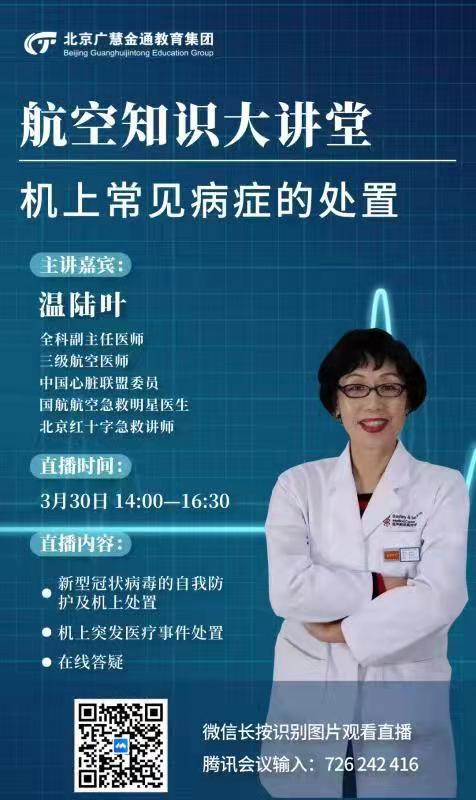 2022年3月30日,应英国上市365官网与北京广慧金通教育科技有限公司邀请,中国心脏联盟委员、国际航空急救明星医生温陆叶通过线上腾讯会议的形式为英国上市365官网航空服务艺术与管理专业师生开展以“航空知识大讲堂”—机上常见病症的处置为主题的专题知识讲座。