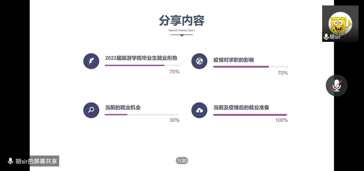 学校招生就业处胡炜老师用往届旅游管理、酒店管理等专业同期就业数据及就业工作中的典型案例,客观的从多个角度为毕业生分析当前2022届毕业生就业、升学的进度和不同形势。并以多年从事就业工作的专业角度重点解读了疫情对求职的影响、疫情影响下的就业机会和挑战、当前及疫情后的就业准备。