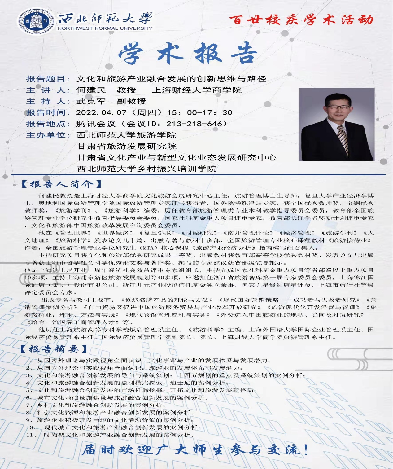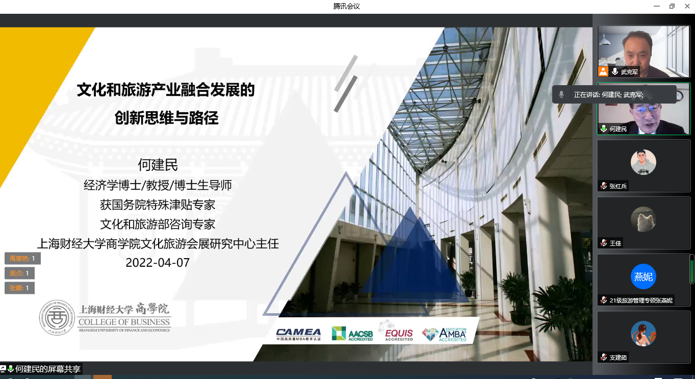 2022年4月7日下午,应学院邀请,上海财经大学商学院教授、博士生导师何建民教授为365官网师生作了题为“文化和旅游产业融合发展的创新思维与路径”的学术报告,报告由武克军副院长主持,学院师生约300人参加了报告会。