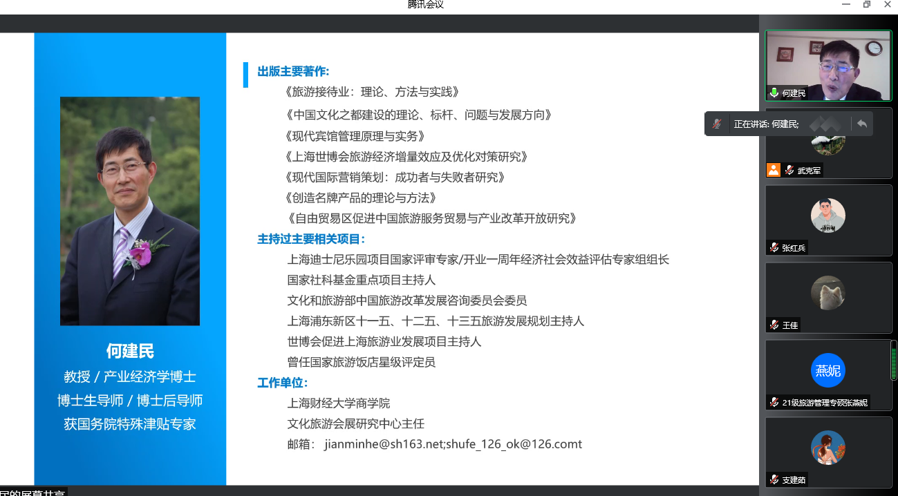 何建民教授是上海财经大学商学院文化旅游会展研究中心主任,旅游管理博士生导师,复旦大学产业经济学博士,奥地利国际旅游管理学院国际旅游管理专家证书获得者,国务院特殊津贴专家,获全国优秀教师奖,宝钢优秀教师奖,《旅游学刊》、《旅游科学》编委。历任教育部旅游管理类专业本科教学指导委员会委员,教育部全国旅游管理专业学位研究生教育指导委员会委员,国家社科基金重大项目评审专家,教育部长江学者奖励计划评审专家,文化和旅游部中国旅游改革发展咨询委员会委员,