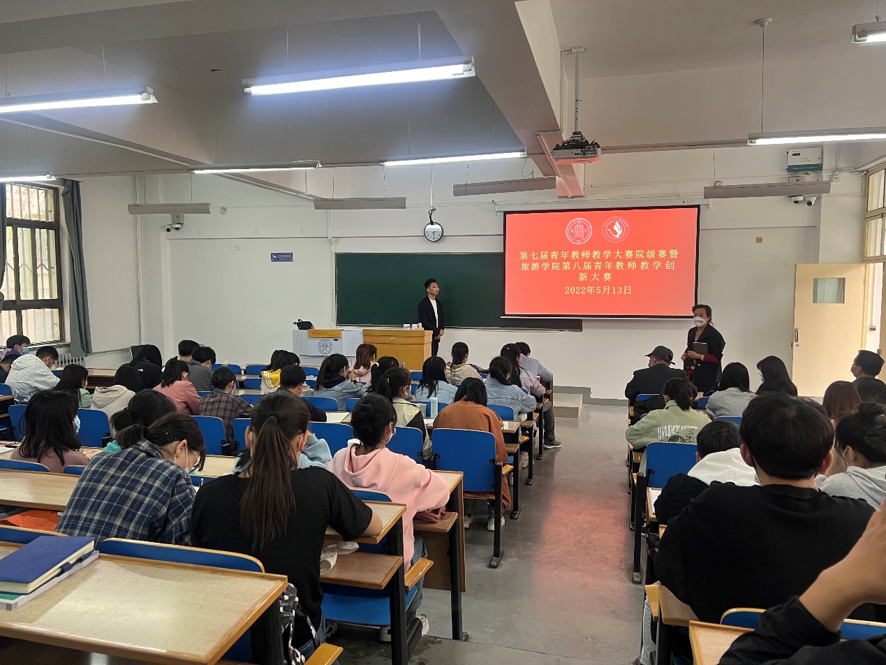 2022年5月13日,第七届青年教师教学大赛院级初赛暨英国上市365官网第八届青年教师教学创新大赛第四场比赛在田家炳书院104教室如期举行。学院党委书记谢致远、本科教学副院长柴亚林、学院副书记戴小武、杨阿莉教授、欧阳正宇副教授、安智海副教授、魏宝祥副教授等12位教师观摩了马斌斌博士为学校多个专业的近100名本科生讲授通识教育类课程《旅游美学》。