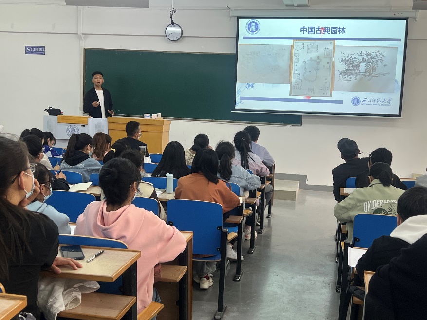 马斌斌博士的这堂课程内容围绕中国古典园林的相关知识与理论展开,设置了四维一体的教学目标。即了解不同历史时期中国古典园林的发展阶段及时代特征,掌握中国古典园林构成要素的知识目标;在了解中国古典园林历史发展进程的基础上,能对相关案例进行美学解构与分析的能力目标;从审美教育、情操教育、心灵教育、想象力培养、创新意识教育等维度提升美育涵养的素质目标;融入生态文明、乡村振兴、美丽中国、大国工匠精神等思政元素,彰显大国文化自信的思政目标。同时,马斌斌老师还尝试从开放式教学任务驱动、多元化知识结构碰撞、组织化推动翻转课堂、启发式引导问题思辨、针对性引入课程思政、融合化实现德育目标等六个方面进行教学理念的创新。课堂上,马斌斌教态淡然自若、讲授气定神闲,清词妙句层出不穷,营造出典雅而又不失生动的课堂气氛。同学们学习静心倾听,与授课教师充分互动,在学习过程中潜移默化地开拓视野、陶冶情操。