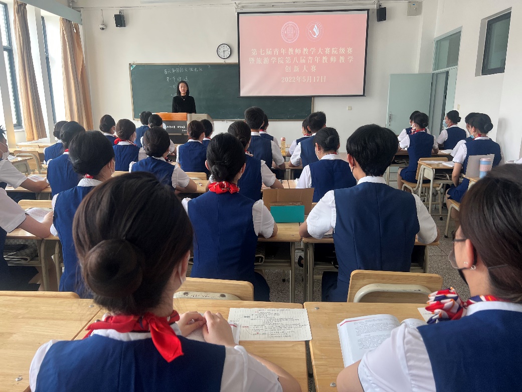 2022年5月17日,第七届青年教师教学大赛院级初赛暨英国上市365官网第八届青年教师教学创新大赛第五场比赛在10号楼A区514教室如期举行。学院本科教学副院长柴亚林、研究生教学副院长王力、行政副院长万建斌、冯玉新教授、魏宝祥副教授、种媛副教授、万抒佳副教授、王伟军博士、侃卓措博士等12位教师观摩了北京广慧金通教育科技有限公司驻西北师范大学工作站主任席聪老师为2021级航空服务艺术与管理专业本科生讲授的《民航服务礼仪》课程。