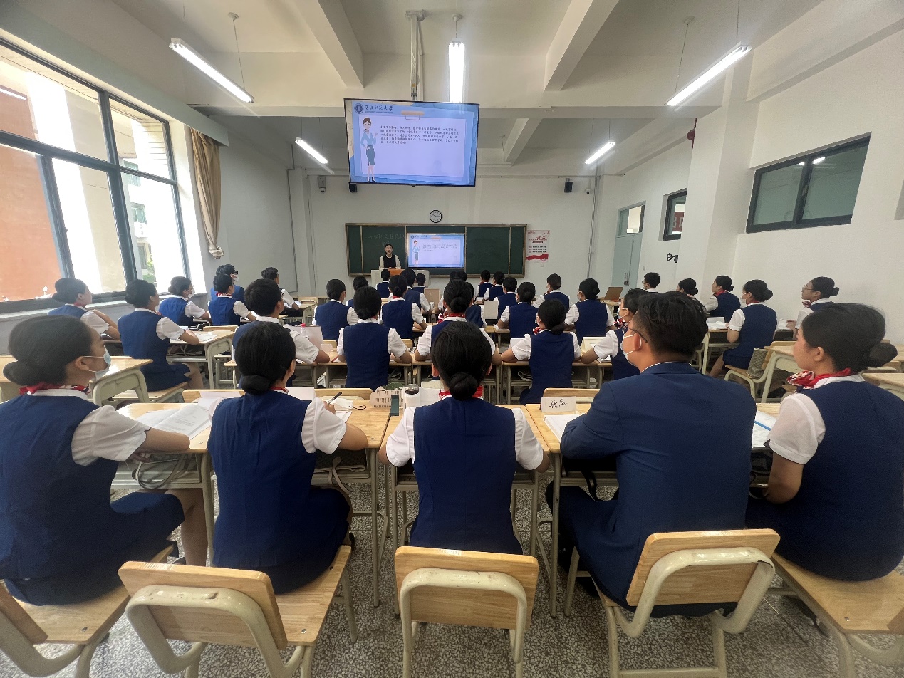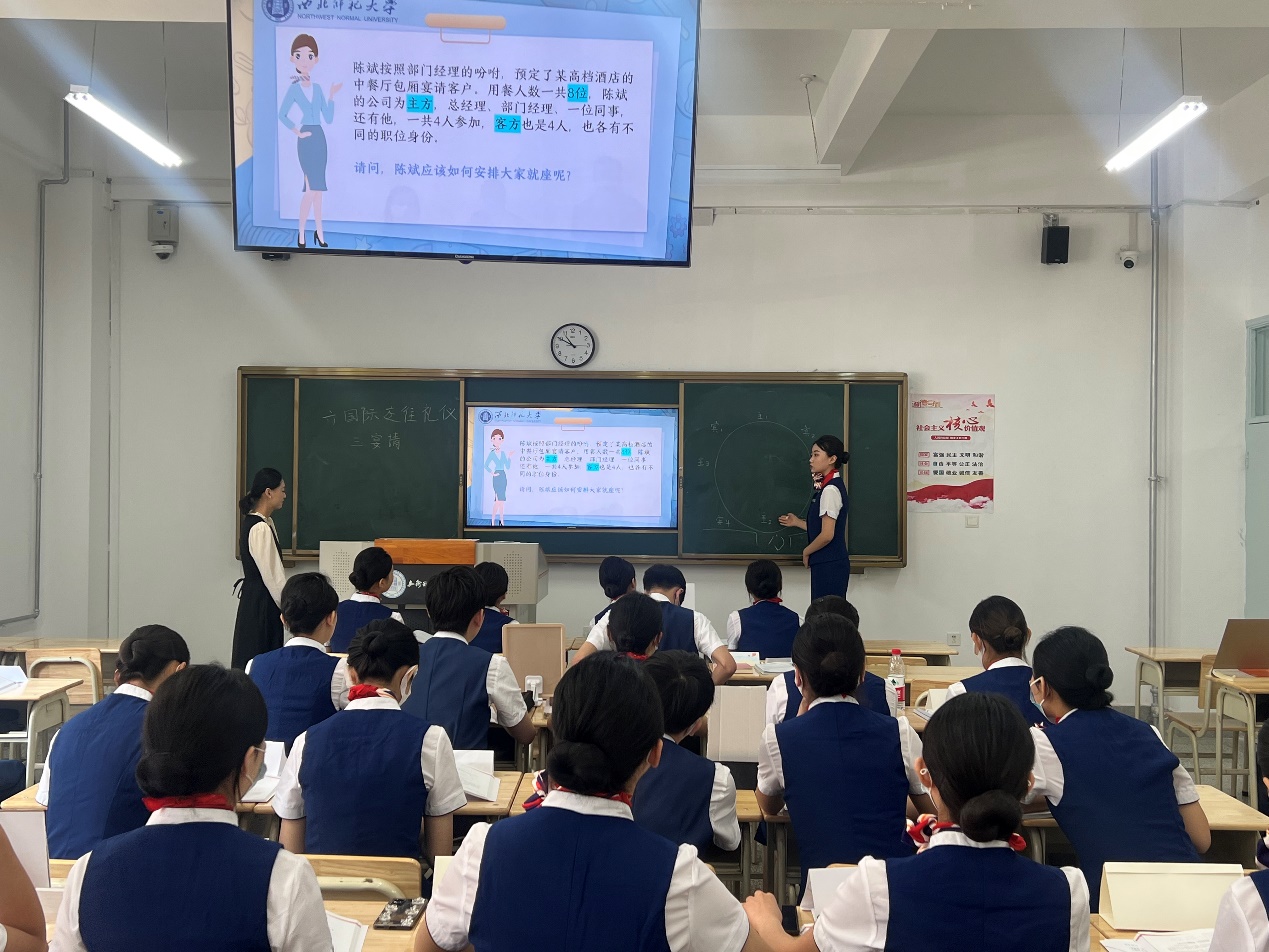 2022年5月18日,第七届青年教师教学大赛院级初赛暨英国上市365官网第八届青年教师教学创新大赛的第六场比赛在10号楼A区114教室如期举行。学院党委书记谢致远、本科教学副院长柴亚林、研究生教学副院长王力、党委副书记戴小武、杨阿莉教授、冯玉新教授、安智海副教授、谢民老师、王伟军博士等11位教师观摩了北京广慧金通教育科技有限公司驻西北师范大学工作站教师殷玥为2021级航空服务艺术与管理专业本科生讲授的《民航服务礼仪》课程。