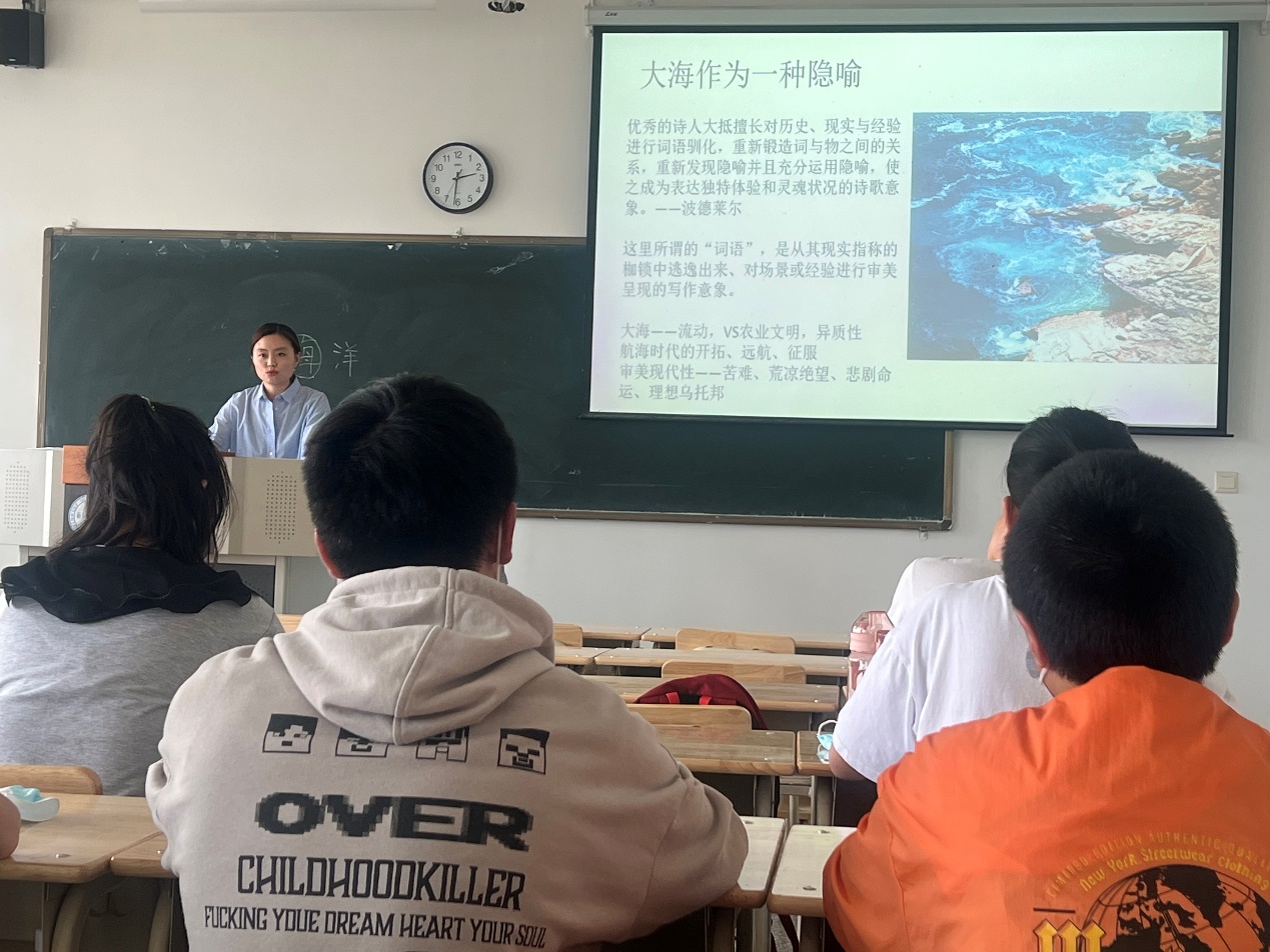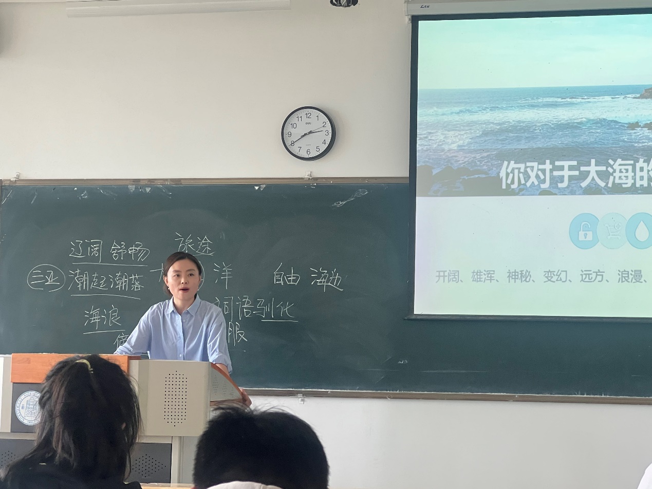 何田田老师对该课堂的设计要旨是培养学生在旅游美学方面的感悟力与鉴赏力,能够理解作者通过游记文字所要表达的思绪与传递的情感;同时,要求学生撰写并在课堂上分享自己旅途上的游记或散文,以此训练学生的文字书写创作能力。何老师在授课过程中灵活运多媒体课件,围绕“游记中的大海”这一专题内容,以图文结合的方式使学生直观感受文字对旅游体验的美学呈现。课堂上,何田田老师情绪饱满、态度亲和,语言表达简洁流畅,理论阐释深入浅出。