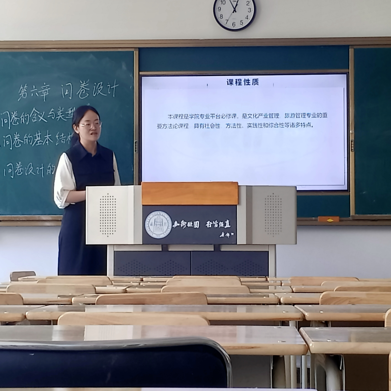 郭星老师讲授的这门课程是学院专业平台必修课,是文化产业管理、旅游管理专业的重要方法论课程,具有社会性、方法性、实践性和综合性等诸多特点。这门课程的知识目标是使学生掌握社会调查的基本理论知识,能力目标是让学生通过该课程的学习而熟练地运用社会调查研究方法和技巧,素质目标是令学生主动用社会研究方法了解社会、认识社会和研究社会现实问题并为之服务。在教学方法方面,郭星老师所采用的教学方法以课堂讲授为主,以案例分析教学与实践教学为辅。课堂上,郭星老师情绪饱满、仪态端庄,用亲切和蔼的语言对学生循循诱导,让学生沿着既定的逻辑思路展开学习活动。