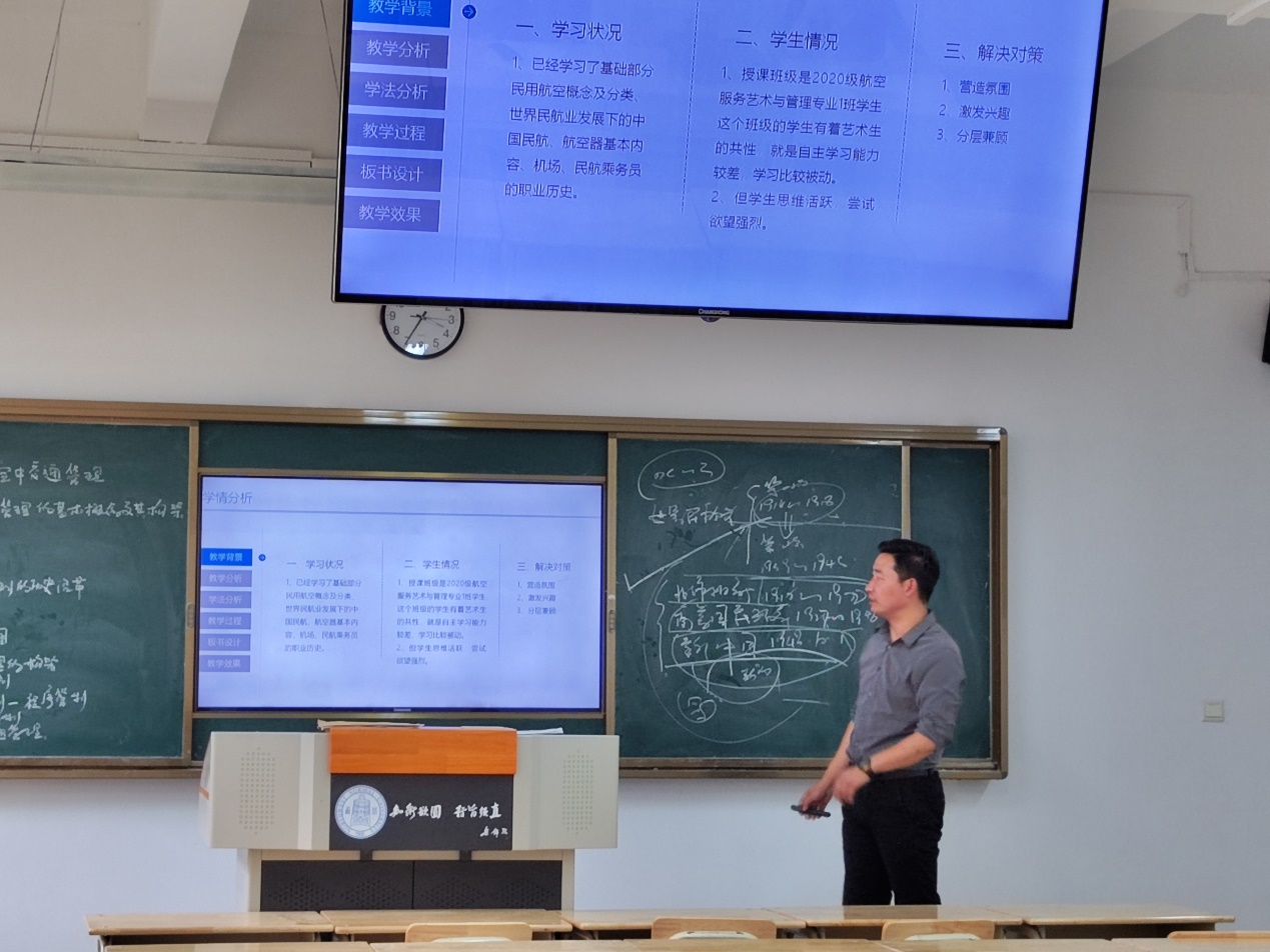 2022年5月26日下午,第七届青年教师教学大赛院级初赛暨英国上市365官网第八届青年教师教学创新大赛的第十四场比赛在教学10号楼A区308教室如期举行。学院航空服务艺术与管理系主任万抒佳、专业实习中心主任陈娟娟、北京广慧金通教育科技有限公司驻西北师范大学工作站主任席聪以及白秀显老师、殷玥老师、宋泽老师等6位教师观摩了邹小强老师为航空服务艺术与管理专业本科生讲授的《民航概论》课程。
