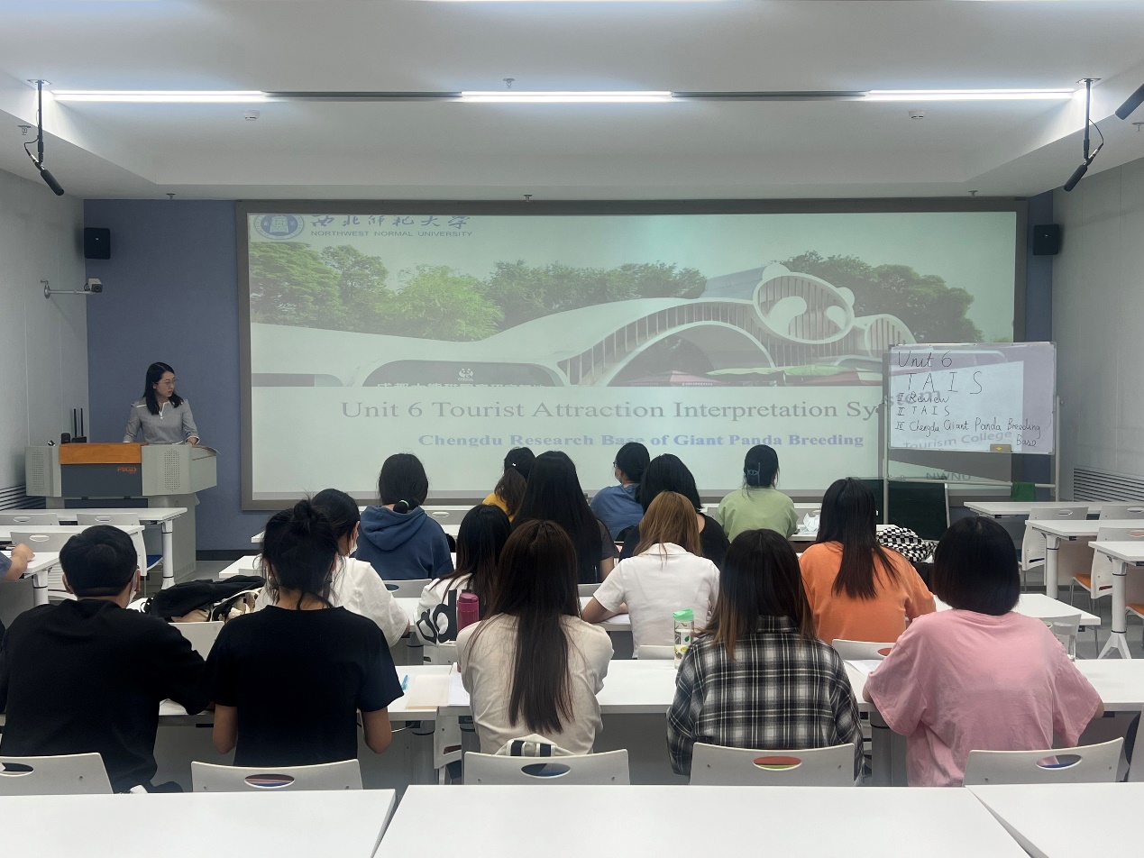 王耀华老师对该课堂的设计要旨是培养学生运用英语对景区、景点进行讲解介绍的口头与书面的表达能力,通过英文文献资料的阅读与理解,掌握正确的表达方式,在跨文化语境中实现适当的沟通互动。王老师将成都市英文旅游宣传片作为案例,分析阐释了成功的景区英语解说所应具备的文本、画面、内容、编码等要素,帮助学生掌握完成景区英语解说的基本策略。课堂上,王耀华老师灵活运用多媒体课件,授课教态自然大方,口语表达和缓流畅,充分调动起学生学习的积极性与主动性。