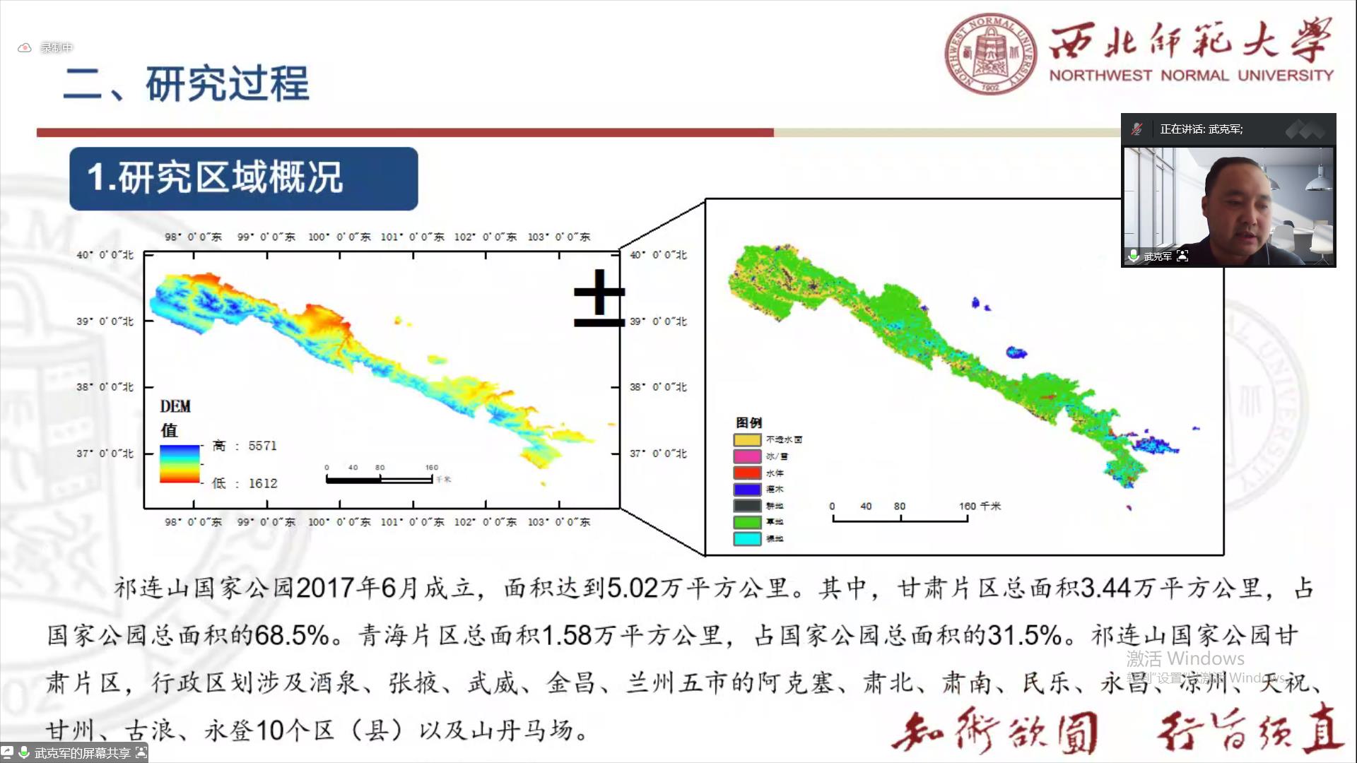 武克军博士以“祁连山国家公园甘肃片区土地利用变化对生态系统服务价值的影响”为题,分别从研究背景、研究过程、研究结果、研究结论四个方面对祁连山国家公园生态服务价值发表自己的看法,认为祁连山国家公园作为”西北生态经济高地”,其生态经济安全是西北地区高质量发展的关键。因此,通过对祁连山国家公园生态服务价值的变化分析,也为“绿水青山就是金山银山”提供了具体验证。
