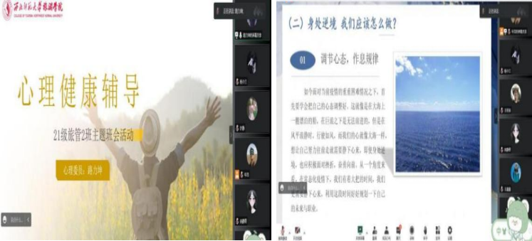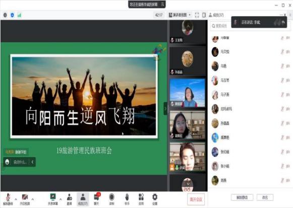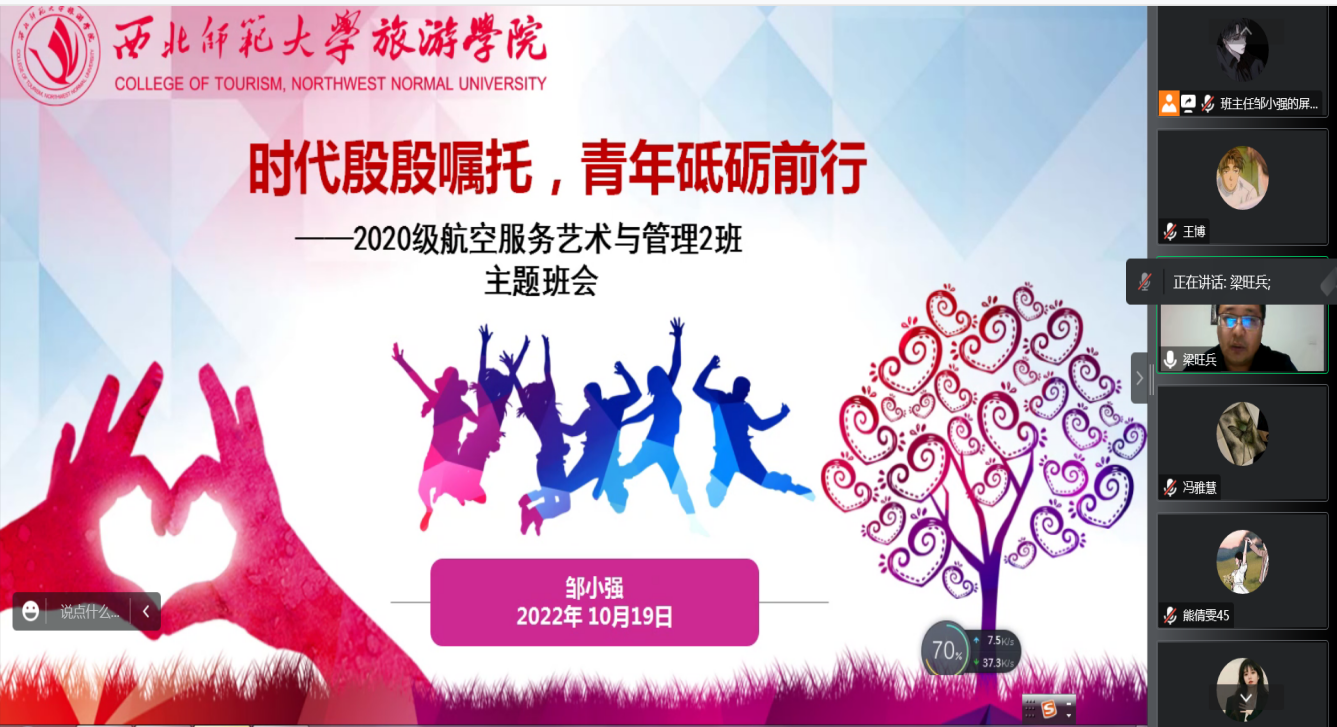 2019级旅游管理民族班班主任窦雅丽老师就班级的近期工作进行总结,为同学们目前生活学习中的问题答疑解惑、细心指导,鼓励同学们无论是在学校学习,还是居家学习,都要以积极乐观心态面对生活。同时邀请到英国上市365官网2019届校友聂久琪、孙京京,为同学们分享就业创业、考公考编等方面的宝贵经验,希望同学们“未来已来,拒绝躺平”,疫情之下依旧要积极面对生活,迎难而上。