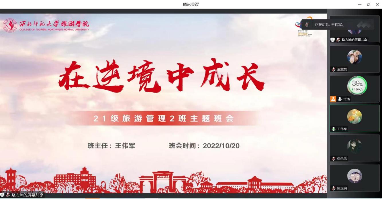 2021级旅游管理2班班主任王伟军老师结合个人求学经历,以此勉励全班同学,疫情正当时,需要每一位同学调整心态,保持旺盛的学习精力,提高适应能力与综合能力,努力做到目标明确,信念坚定,行为有效。这场疫情对于每个人来说都是一次“大考”,需要大家的共同努力和责任担当,从而真正学会在逆境中成长。