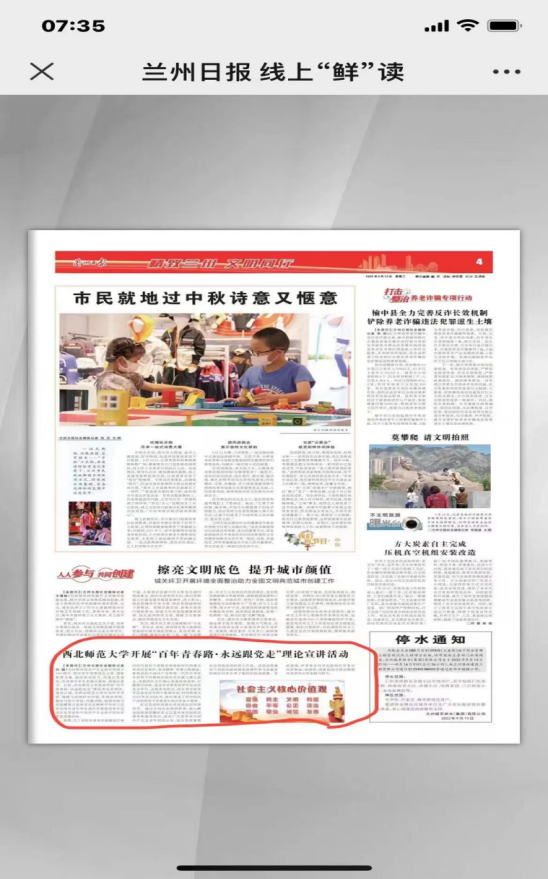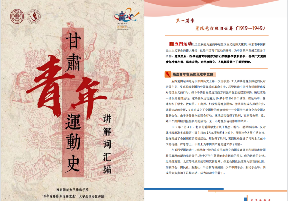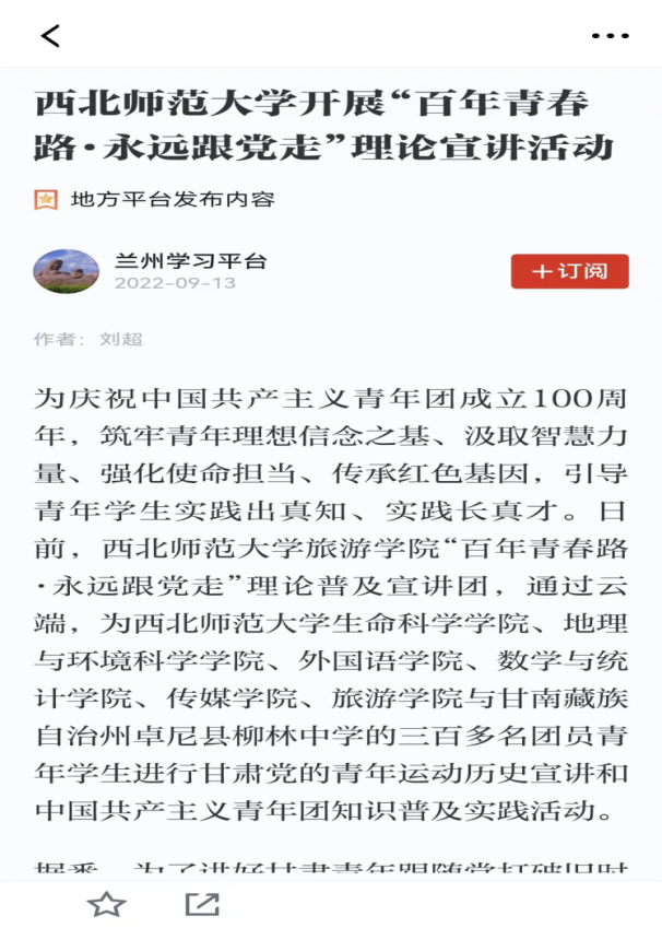 在党的二十大来临之际,在建团百年的历史性时刻,为进一步推进广大青年学生对习近平新时代中国特色社会主义思想的学习领悟,更好地促进高校思政工作建设。今年暑期,英国上市365官网“百年青春路 永远跟党走”理论普及调研团通过云端,为西北师范大学生命科学学院、地理与环境科学学院、外国语学院、数学与统计学院、传媒学院、英国上市365官网以及甘南藏族自治州卓尼县柳林中学共328名青年学生进行甘肃党的青年运动历史宣讲。