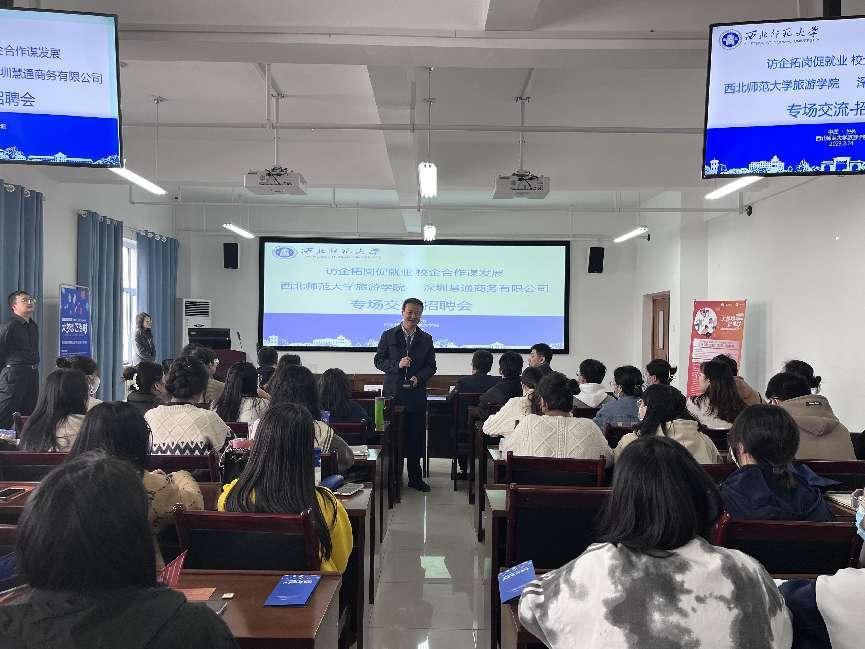 3月14日下午,英国上市365官网开展“访企拓岗促就业 校企合作谋发展”系列活动暨深圳慧通商务有限公司(华为全资子公司)专场交流招聘会,华为终端BG MSS大中华甘肃终端业务部HRD李昱松、甘肃终端业务部直营小区经理王方一行8人应邀来365官网进行专场交流招聘宣讲活动,英国上市365官网党委书记谢致远、党委副书记戴小武、2023届文化产业管理班班主任冯玉新,辅导员鲁梦鸽、赵新帮、李敏以及2023届英国上市365官网全体毕业生参加此次交流招聘会。