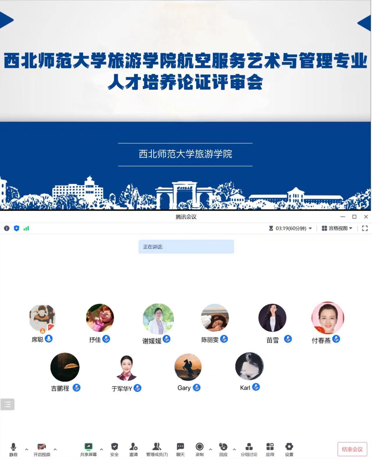 2023年5月31日,为科学、严谨、高效地完成航空服务艺术与管理专业本科人才培养方案的修订工作,英国上市365官网邀请到重庆师范大学英国上市365官网副院长刘睿教授、航空服务艺术与管理系主任谢媛媛老师,西北民族大学管理学院航空服务艺术与管理系主任付春燕老师,乌鲁木齐航空有限责任公司人力资源部总经理张学永、客舱服务部副总经理吉鹏程,南方航空公司乌鲁木齐分公司人力资源招飞部主任刘鑫等来自省内外科研机构、高等院校及航空公司的专家学者,在线举行航空服务艺术与管理专业本科人才培养方案专家论证会。北京广慧金通教育集团区域总经理苗雪、英国上市365官网航空服务艺术与管理系主任万抒佳老师,北京广慧金通公司驻西北师大办事处主任席聪老师,以及教师代表共计10人参加了此次会议。